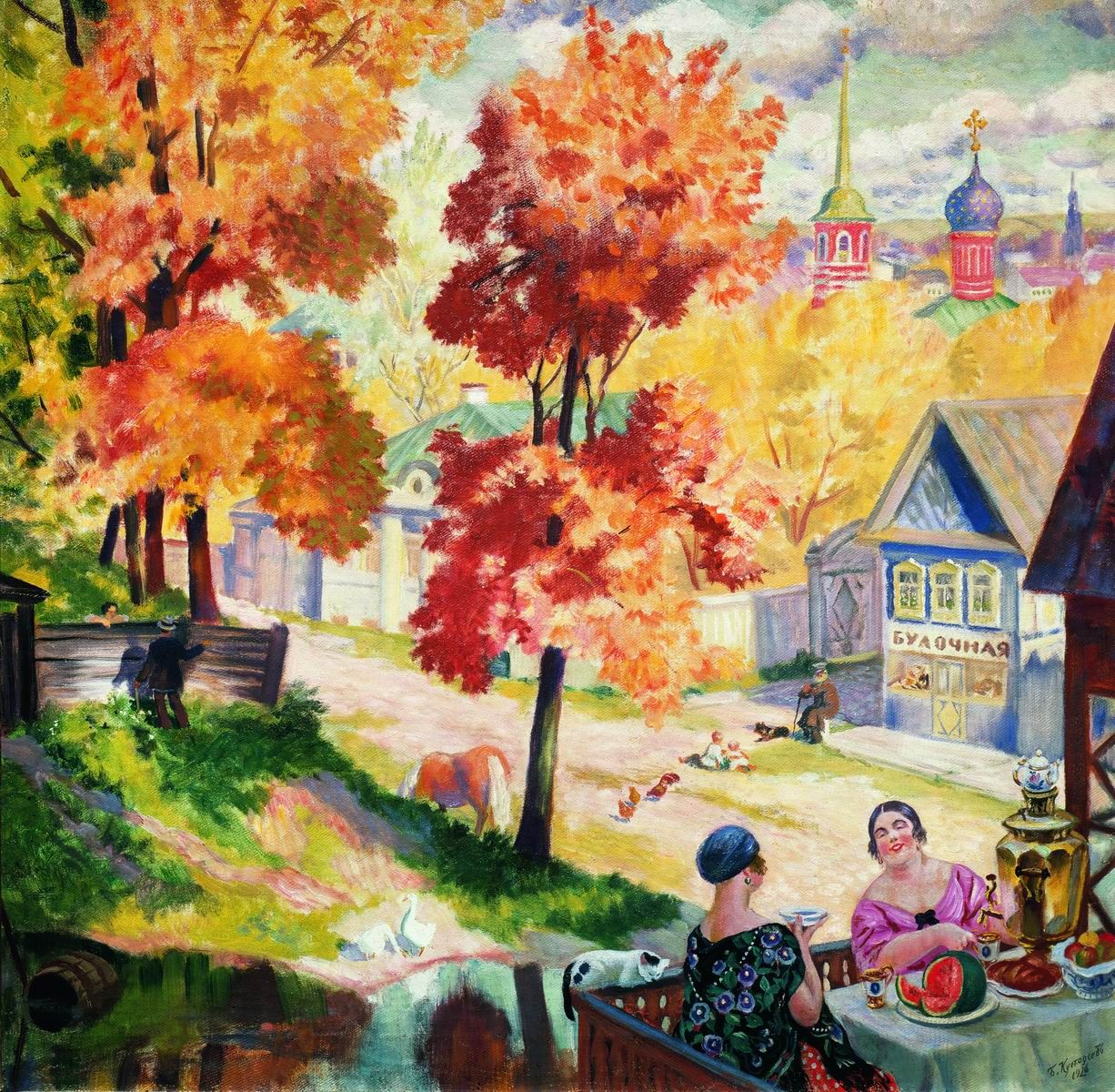 Купчихи в осеннем интерьере. Излюбленную тему Борис Кустодиев разбавил теплыми красками. Огненно-красные клены и желтеющий сад у провинциальных домиков делают осень особенно уютной. То самое бабье лето, которое на время примиряет с красивыми, но, увы, неизбежно облетающими листьями. В прозрачном воздухе витает аромат листвы, арбуза и свежего хлеба из маленькой булочной. И уж, конечно, никакая осень не страшна, если поблизости кот. Вкупе с самоваром.
