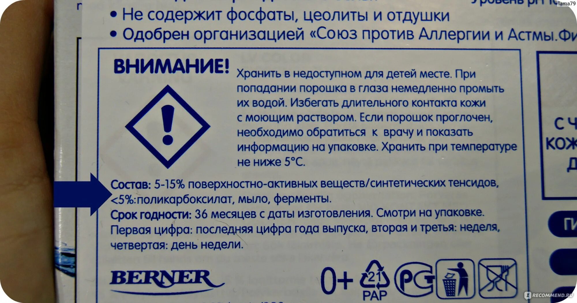 Состав. В нём могут быть указаны как отдельные вещества, так и группы веществ с указанием их процентного содержания. Сначала отражают сырьё с наибольшей массовой долей и перечисляют составляющие в порядке убывания. Важно убедиться в отсутствии агрессивных веществ, таких как фосфаты и хлор, которые оказывают раздражающее действие на кожу и органы дыхания.