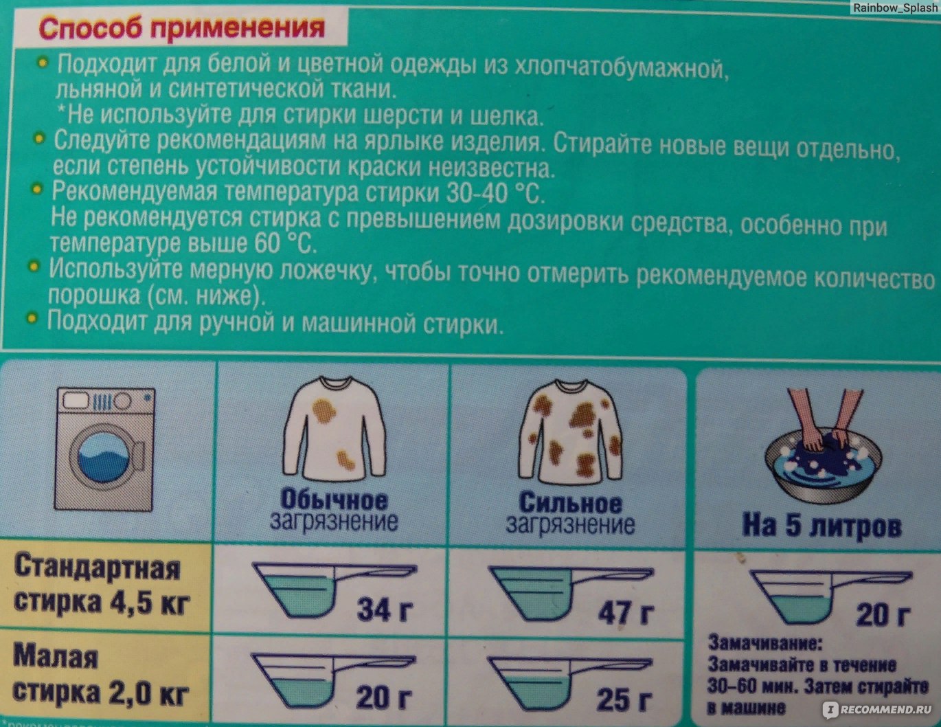 Не превышать рекомендованную дозировку. Согласно инструкции, на определённый вес грязного белья рекомендуется конкретное количество стирального порошка.