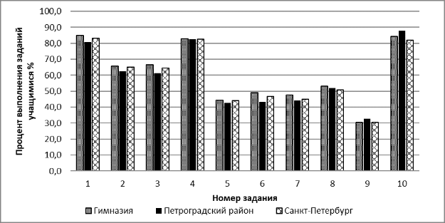 Санкт-Петербурга. В сентябре 2023 года он вместе с одноклассниками писал региональную диагностическую работу по оценке метапредметных результатов. На сайте гимназии Денис увидел сравнительную диаграмму выполнения заданий учащимися 8-х классов своей гимназии, района и города.