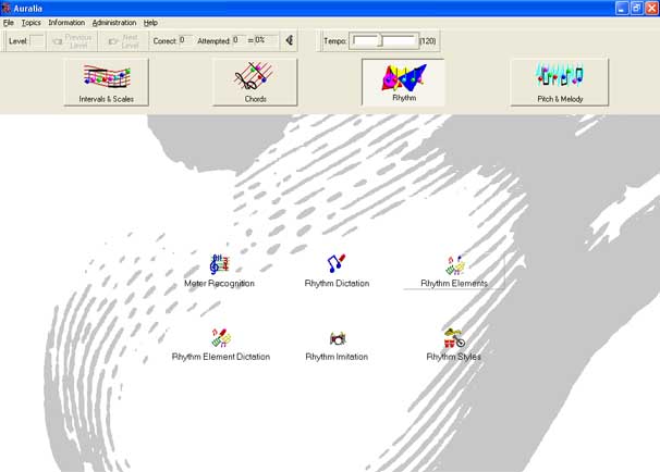 1. В упражнении на определение размера (Meter Recognition) программа играет какой-либо ритмический рисунок длиной четыре такта и просит определить размер такта. Ритмический рисунок может быть дан двумя способами: в первом случае ритм играется звуком малого барабана, во втором — духовым инструментом в виде какой-либо мелодии. Есть восемь уровней сложности.