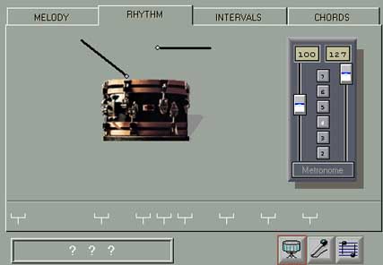 5. Упражнение на имитацию ритма проходит под метроном. Вначале дается вступительный такт, затем — ритм длиной несколько тактов. После того, как ритм задан, метроном продолжает звучать, а ответ можно начинать по мере готовности. Для "настукивания" можно использовать клавишу пробела либо одну из клавиш MIDI-клавиатуры. По окончании ввода программа ждет около секунды и выдает результат, правда, только в виде "правильно/неправильно". Ответ нельзя проконтролировать на экране графически и увидеть допущенные ошибки, что, конечно, нехорошо. В