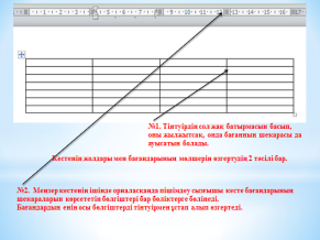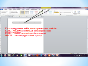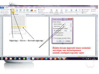 | Күтілетін нәтиже | Кестені құрып, кестенің жолдары мен бағандарының мөлшерін өзгертіп, элементтерін ерекшелеп, құрылымын өзгертіп,түзете алады. | |||||