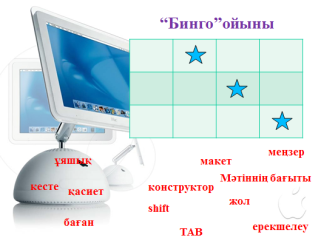 | 3 топпен «Бинго» ойыны Дәптерге кесте сызады.кесте-нің ішіне жаңа сабақтағы басты сөздерді теріп жазады. Мұғалім бір-бірлеп сөздер айтады, сол айтылған сөздер бар болса, оқушылар әр-бір табылған сөзін сызып отырады | Оқушы дәптерге кесте сызып, ішін сөздермен толықтырады. | 7 мин | ||