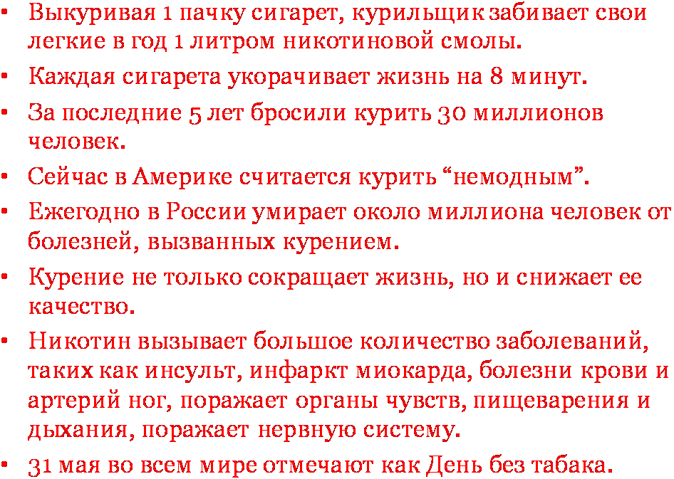 При курении человек вдыхает тот же ядовитый газ, что содержится в выхлопных газах автомобильного двигателя. Это угарный газ. Он, соединяясь с красными кровяными тельцами, уменьшает количество кислорода, переносимого кровью.