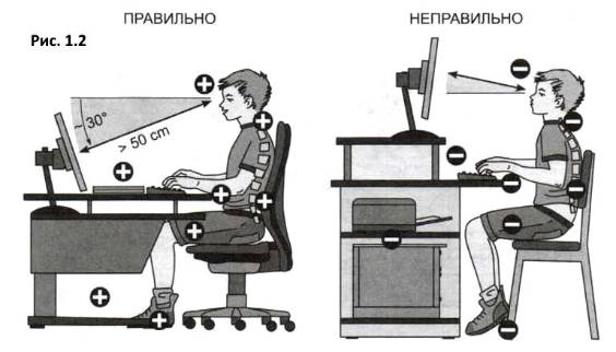 Монитор должен находиться на уровне глаз или чуть ниже — это позволит смотреть на экран, не наклоняя голову вперёд или назад. Расстояние до экрана — примерно 45–75 см. Если используется несколько мониторов, расположить их так, чтобы минимизировать повороты головы.