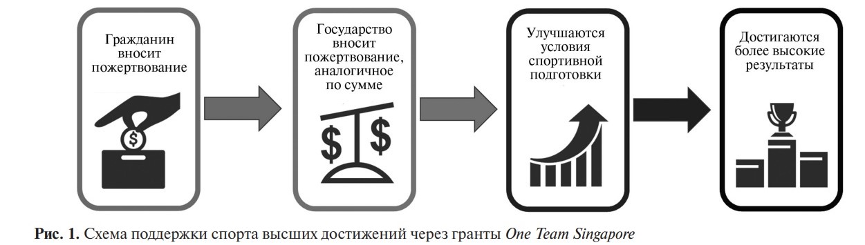 Гранты – денежные выплаты, осуществляемые в пользу физических или юридических лиц, с целью финансирования их текущей деятельности или конкретного проекта. Гранты могут выделяться государством как напрямую, так и через негосударственные организации, обычно – некоммерческие фонды. Получатели – отдельные спортсмены и тренеры, клубы, федерации, организаторы мероприятий. Поддержка спортсменов высших достижений. В современных условиях грантовая поддержка стала ключевым ресурсом при подготовке спортсменов высших достижений [3]. При выделении денег исходят из показателей результативности спортсменов. Так, в Сингапуре государственная система грантов предполагает градацию результатов по четырем уровням. В зависимости от присвоенного уровня спортсмены получают доступ к участию в различных программах грантовой поддержки. Гранты могут быть прямыми (ежемесячная денежная стипендия) либо косвенными (оплата обучения в университете или медицинского обеспечения). С 2014 г. также работает фонд поддержки спортсменов OneTeam SingaporeFund . Его механизм предполагает, что в течение 5-летнего срока с 2017 по 2022 г. любые добровольные пожертвования жителей Сингапура будут дополнены государственной субсидией аналогичного размера (рис. 1). На эти цели в госбюджете заложено 50 млн синг. долл.