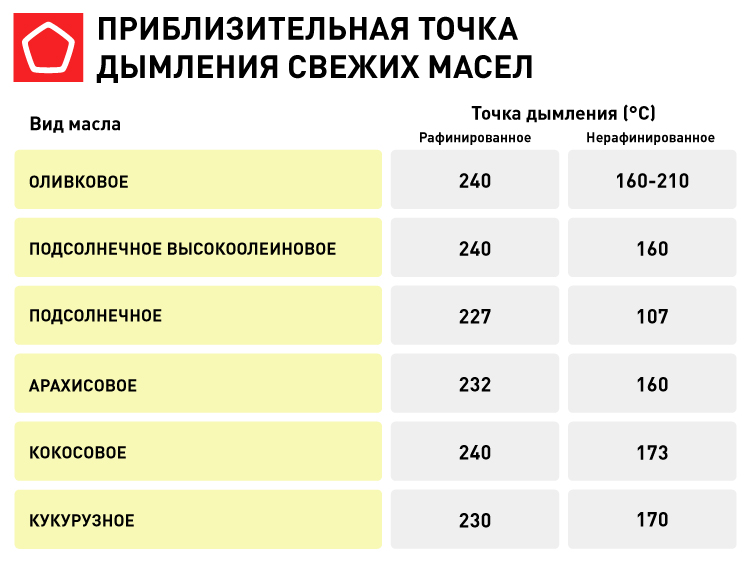 Этот кулинарный термин обозначает температуру, при которой масло начинает кипеть и дымиться. Чем выше температура, тем лучше масло подходит для обжаривания. Идеальной температурой считается 200–250 °C, приемлемой для жарки — 150–180 °C. Если точка дымления ниже 180 °C, масло лучше оставить для салатов и гарниров.