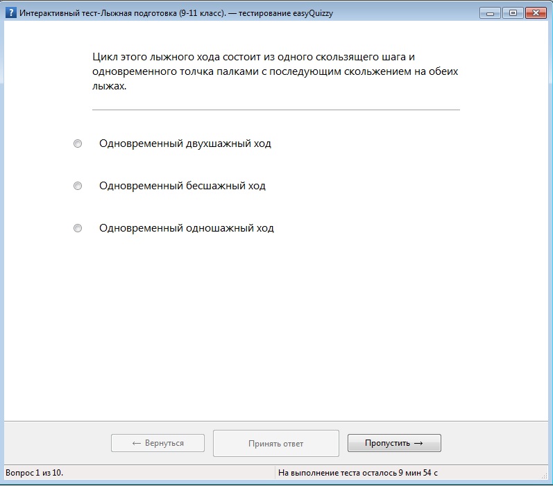 Интерактивный тест по лыжным ходам выполнен для применения на уроках по теоретической подготовки учащихся 9-11 классов. Цель теста выявление уровня теоретических знаний по лыжной подготовке учащихся. В тесте 10 вопросов на которые необходимо ответить за 10 минут. Есть возможность сохранять результаты теста. Тест выполнен с помощью сайта http://www.ski.ru/.