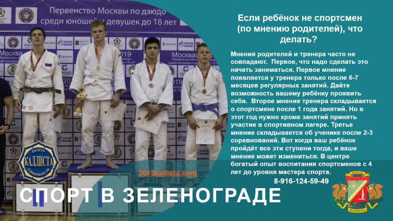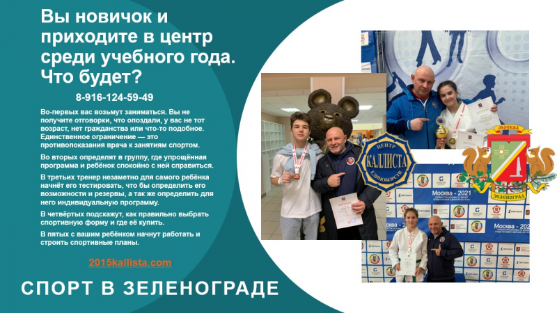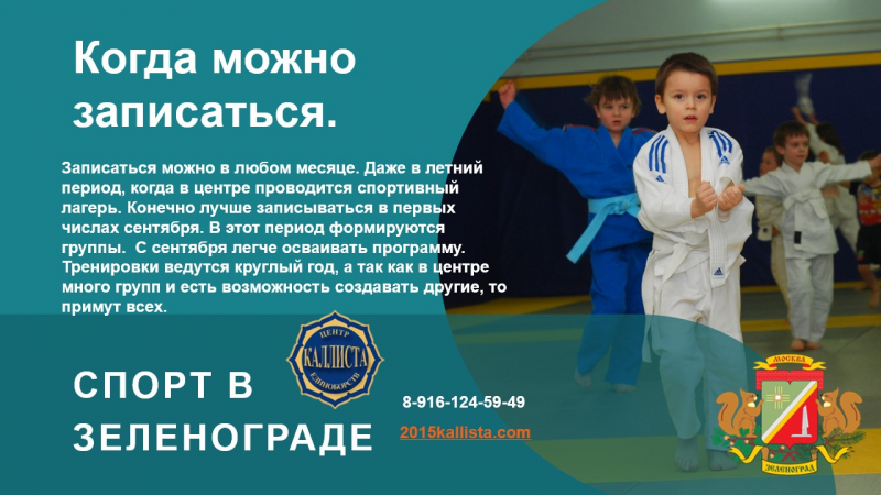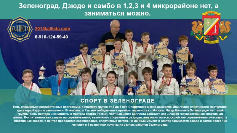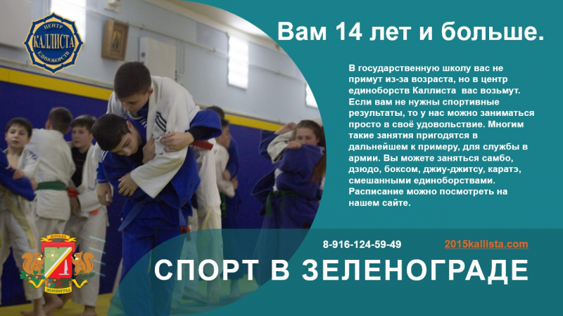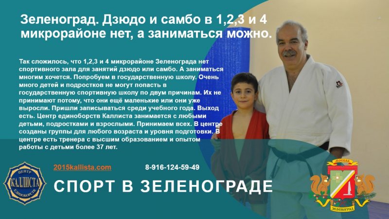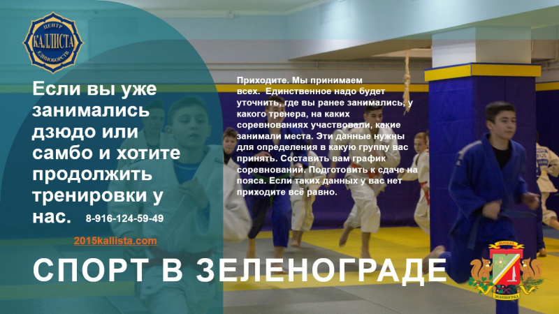 Так сложилось, что 1,2,3 и 4 микрорайоне Зеленограда нет спортивного зала для занятий дзюдо или самбо. А заниматься многим хочется. Попробуем в государственную школу. Очень много детей и подростков не могут попасть в государственную спортивную школу по двум причинам. Их не принимают потому, что они ещё маленькие или они уже выросли. Пришли записываться среди учебного года. Выход есть. Центр единоборств Каллиста занимается с любыми детьми, подростками и взрослыми. Принимаем всех. В центре созданы группы для любого возраста и уровня подготовки. В центре есть тренера с высшим образованием и опытом работы с детьми более 37 лет.