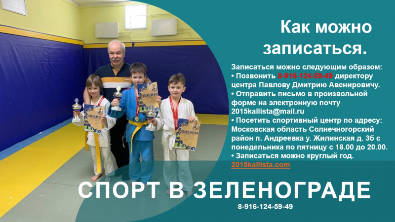 Записаться можно следующим образом: • Позвонить 8-916-124-59-49 директору центра Павлову Дмитрию Авенировичу. • Отправить письмо в произвольной форме на электронную почту [email protected] • Посетить спортивный центр по адресу: Московская область Солнечногорский район п. Андреевка у. Жилинская д. 3б с понедельника по пятницу с 18.00 до 20.00. • Записаться можно круглый год. 2015kallista.com